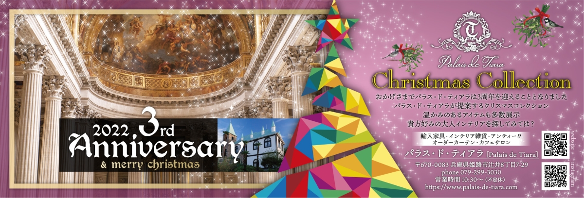 Palais de Tiara[パラス・ド・ティアラ]では、上質で品のある輸入家具を中心に、インテリア雑貨・アンティークなどを様々にご用意して2019年11月23日に兵庫県姫路市でプレオープン・12月3日にグランドオープンいたしました。